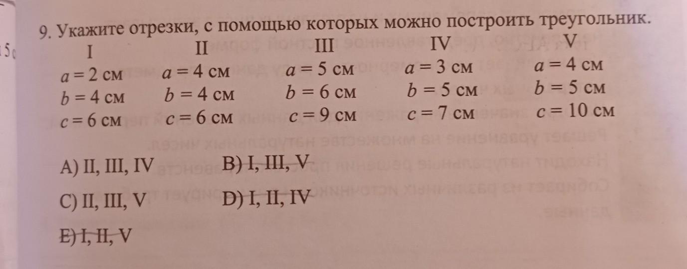 о. Укажите отрезки, с помощью которых можно построить треугольник. I II a = 2 см b = 4 см с = 6 см a = 4 см b = 4 см с = 6 см Ш IV a = 5 CM a = 3 CM b = 6 CM b = 5 см с = 9 см с = 7 см V a = 4 CM b = 5 CM с = 10 см