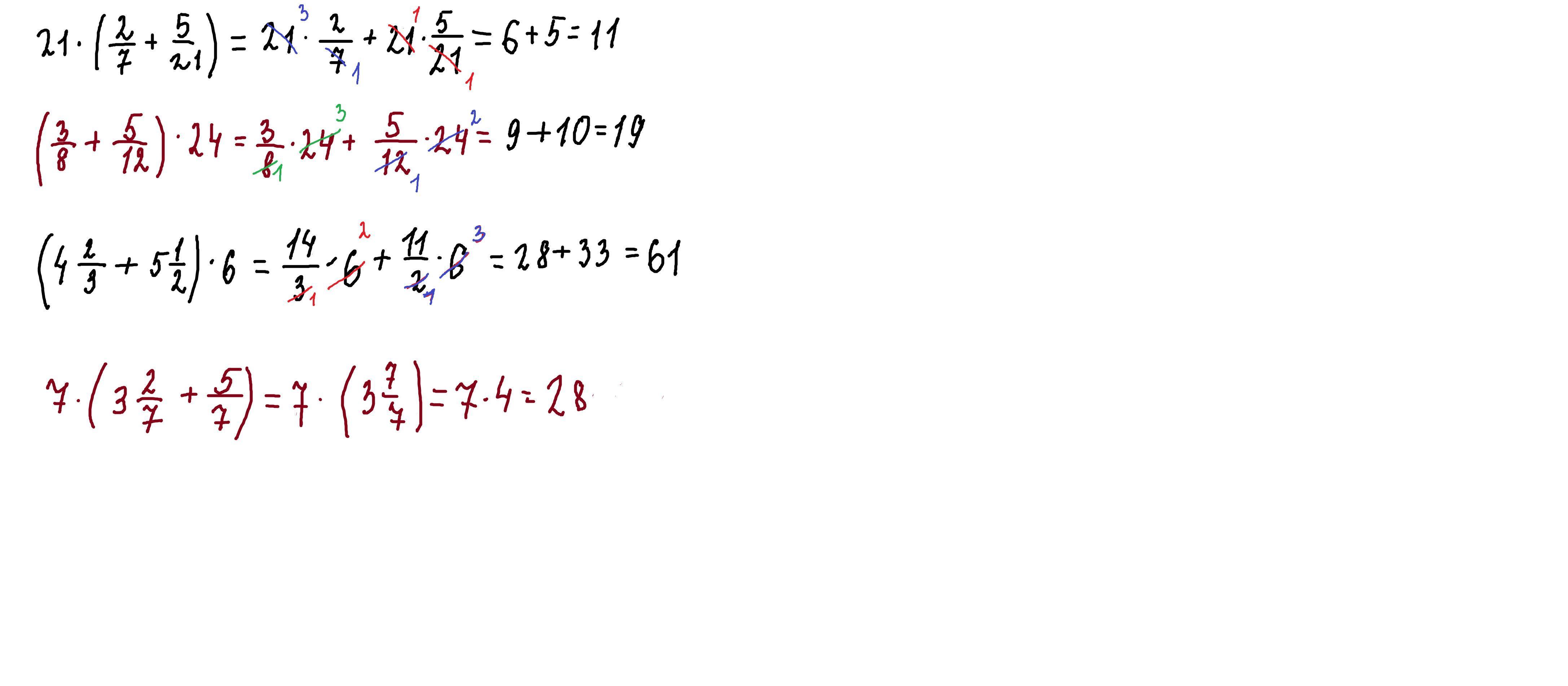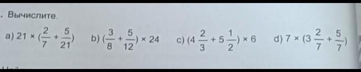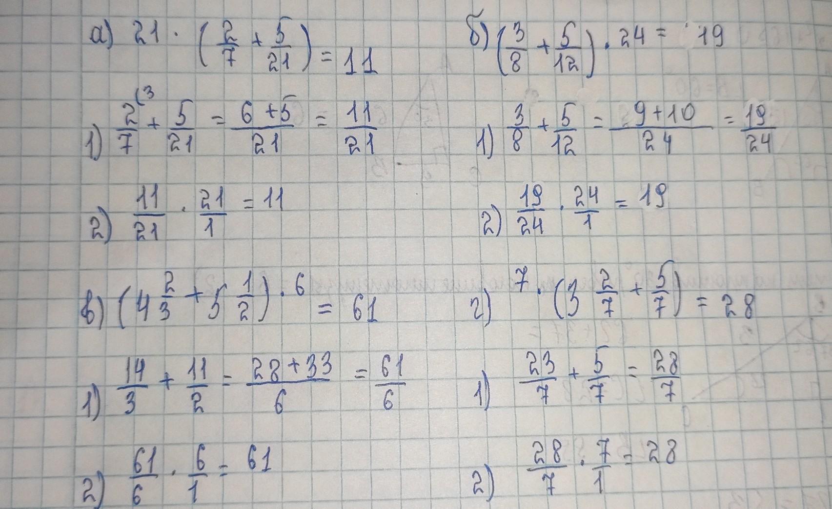 в данных примерах удобнее будет применить распределительный закон умножения,т.е каждое число в скобках умножить на число,которое за скобкой,(это чтобы не приводить дроби к общему знаменателю).в последнем примере сначала сложим,потом умножим. извините,на листочке не могу,комп не фоткает.