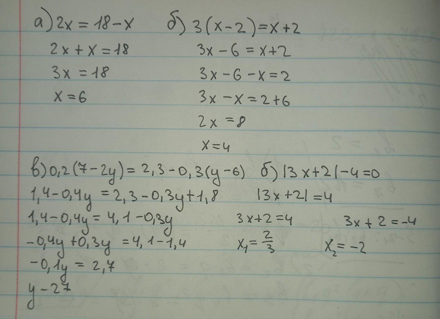 в) 0,2(7 – 2y) = 2,3 – 0,3(у – 6);