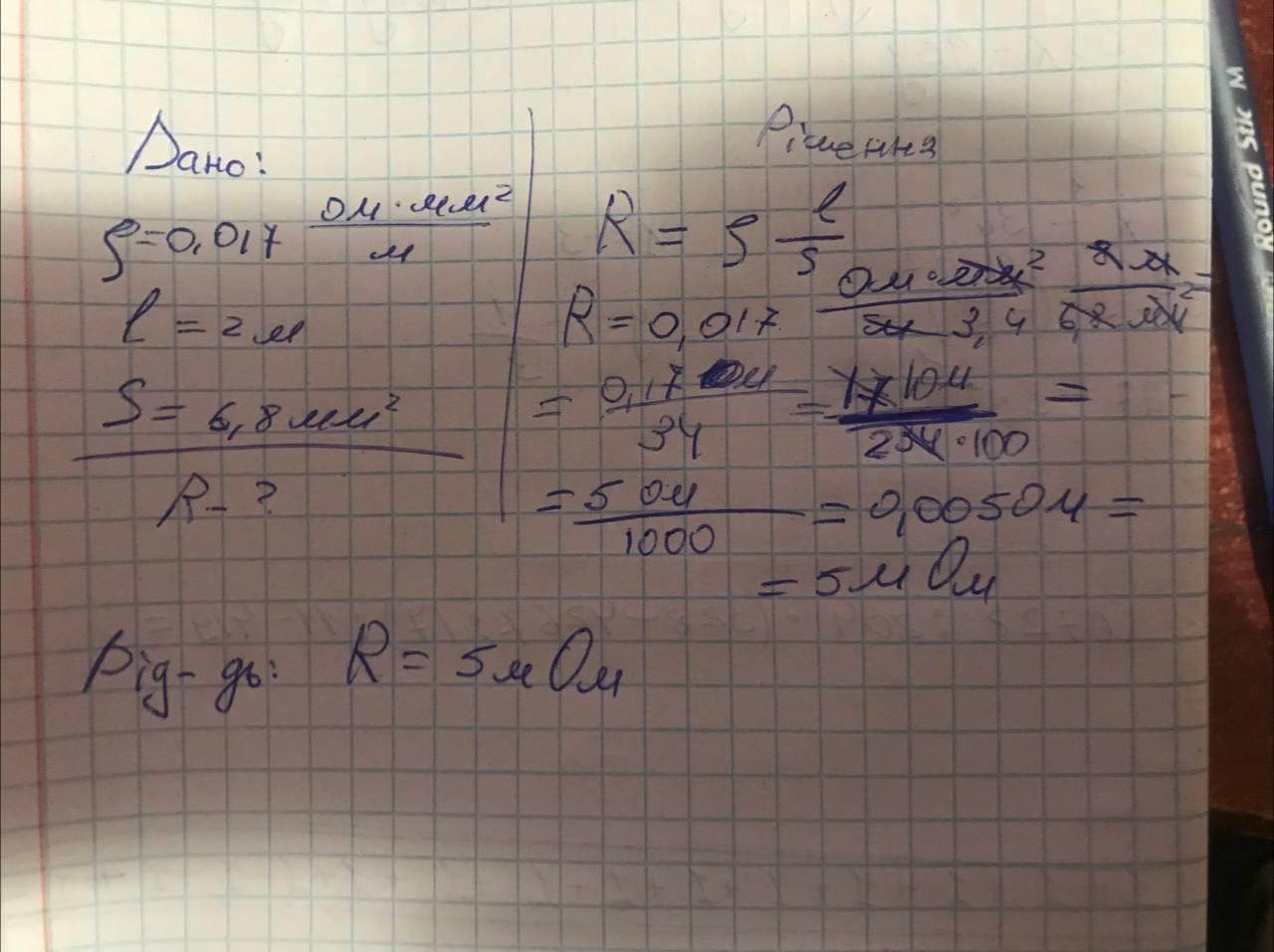 обчисліть опір мідного дроту завдовжки 2м якщо площа його поперечного перерізу становить 6.8 мм квадратних