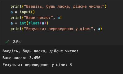 На вході маємо дійсне число, яке запитується у користувача. Програма переводить його в ціле та виводить результат (не використовувати додаткові повідомлення).