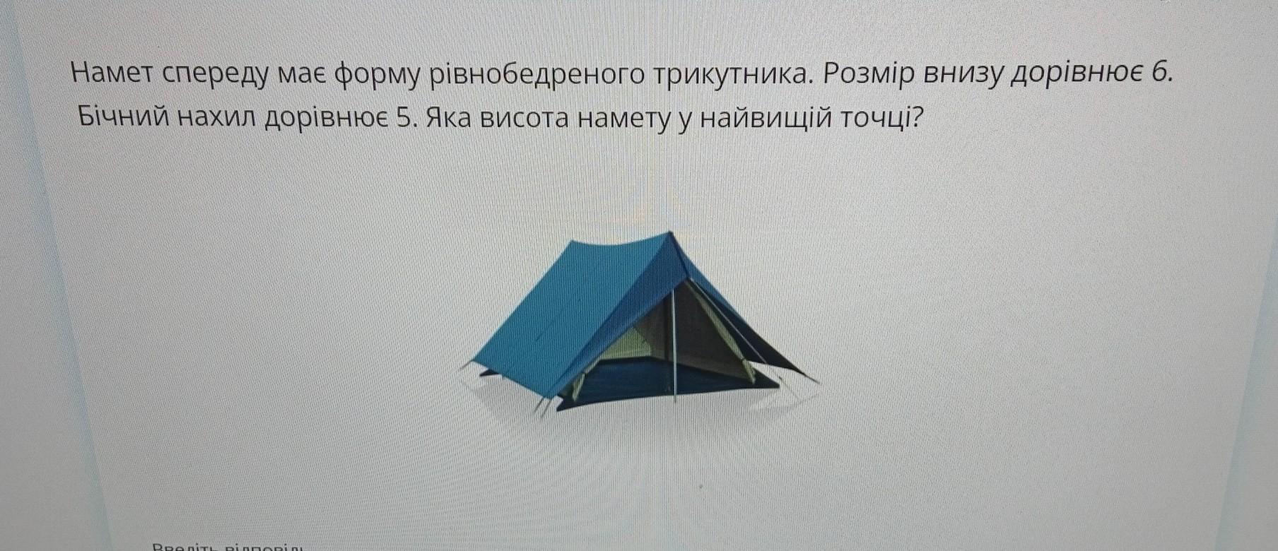 де `h`- висота намету у найвищій точці, а 3 - довжина кожної зі сторін рівнобедреного трикутника, що опираються на основу.