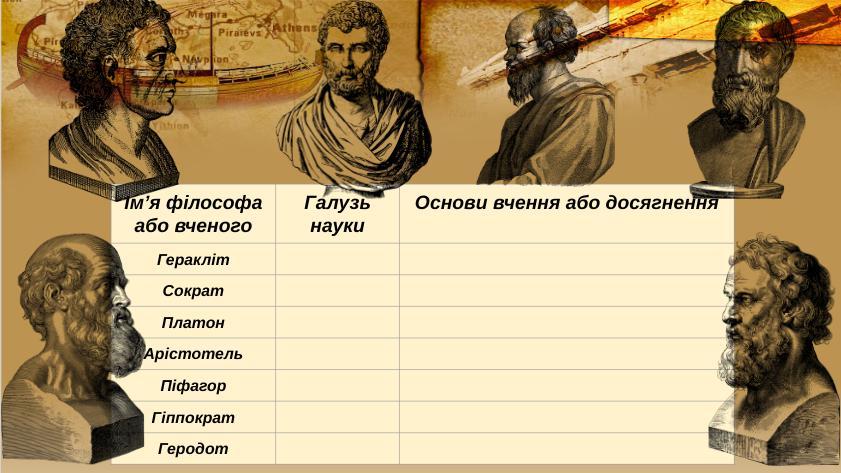6) Гiппократ - медицина. Одним из его известных учений является присяга Гиппократов, которая стала основой этики в медицине.
