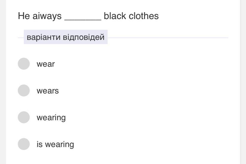 Wears, бо слово «always” вживається в Present Simple, а оскільки в нас дано 3ю особу однини - Не, то до дієслова додаємо закінчення -s
