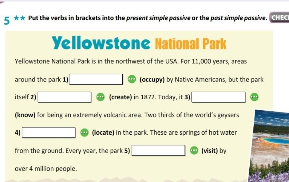 Yellowstone National Park is in the northwest of the USA. For 11,000 years, areas around the park were occupied by Native Americans, but the park itself was created in 1872. Today, it is known for being an extremely volcanic area. Two thirds of the world's geysers are located in the park. These are springs of hot water from the ground. Every year, the park is visited by over 4 million people.