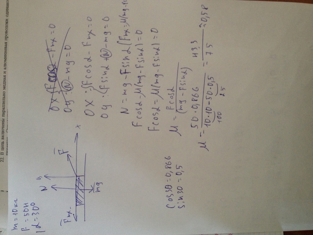 Тело массой 10 кг. тянут по горизонтальной поверхности, прикладывая силу 50 H, направленную под углом 30 градусов.Найдите коэффициент трения между телом и поверхностью.