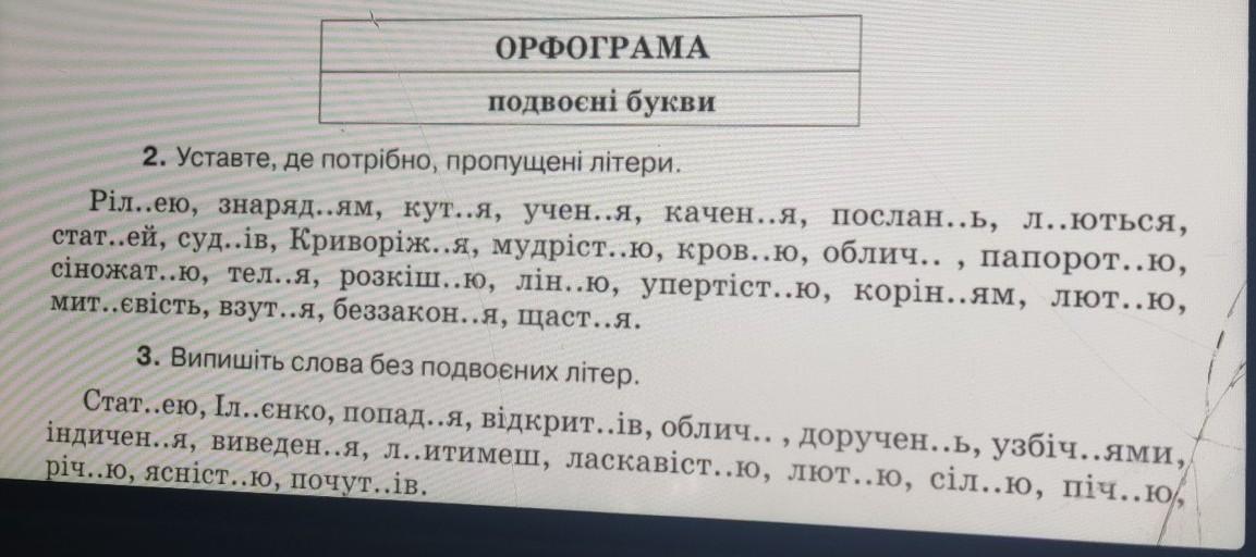 у 2 завдання я виписала лише ті, де потрібно вставити пропущені літери. у 3 завданні я виписала лише ті, де не потрібно подвоювати літери