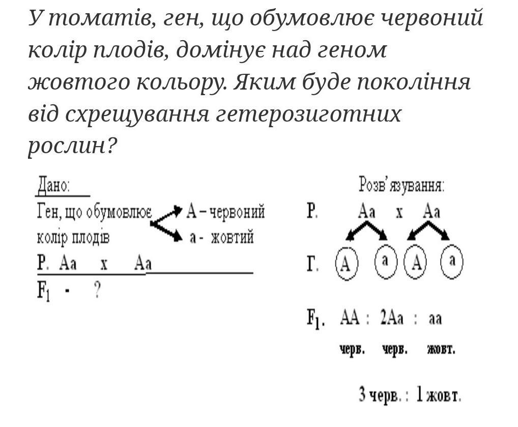 Червоне забарвлення плодів помідорів домінуе над жовтим забарвленням плодів. Схрестили дві гетерозиготні особини. Яких нащадків слід очікувати?