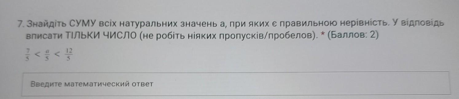 7. Знайдіть СУМУ всіх натуральних значень а, при яких є правильною нерівність. У відповідь вписати тiльки число (не робіть ніяких пропусків/пробелов). * (Баллов: 2) допоможить будласко