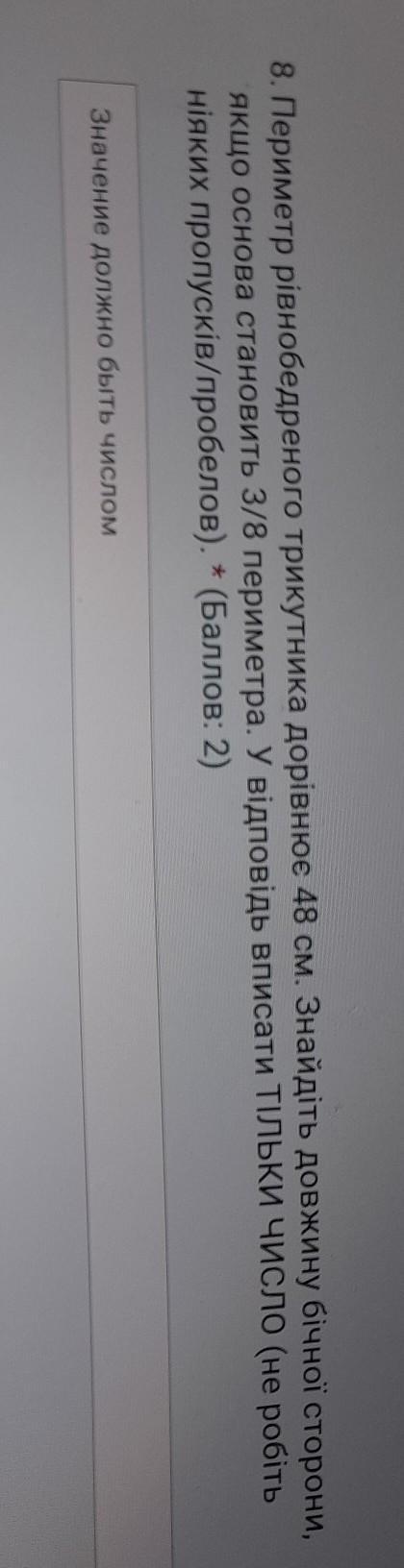 8. Периметр рівнобедреного трикутника дорівнює 48 см. Знайдіть довжину бічної сторони, якщо основа становить 3/8 периметра. У відповідь вписати ТІЛЬКИ ЧИСЛО (Не робіть ніяких пропусків/пробелов). * (Баллов: 2) Значение должно быть числом