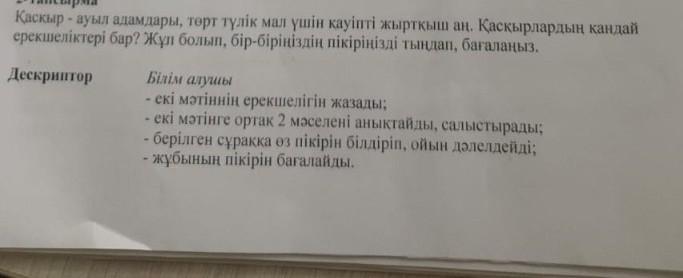 2-тапсырма Каскыр - ауыл адамдары, төрт түлік мал ушiн кауiптi жырткыш ан. Каскырлардын кандай ерекшеліктері бар? Жұп болып, бiр-бiрiнiздiн пiкiрiнiздi тындап, багаланыз. Дескриптор Бiлiм алушы - екі мәтіннің ерекшелiгiн жазады: - екі мәтінге ортак 2 мәселені аныктайды, салыстырады; - берілген суракка өз пiкiрiн бiлдiрiп, ойын дәлелдейдi; - жұбының пiкiрiн бағалайды.