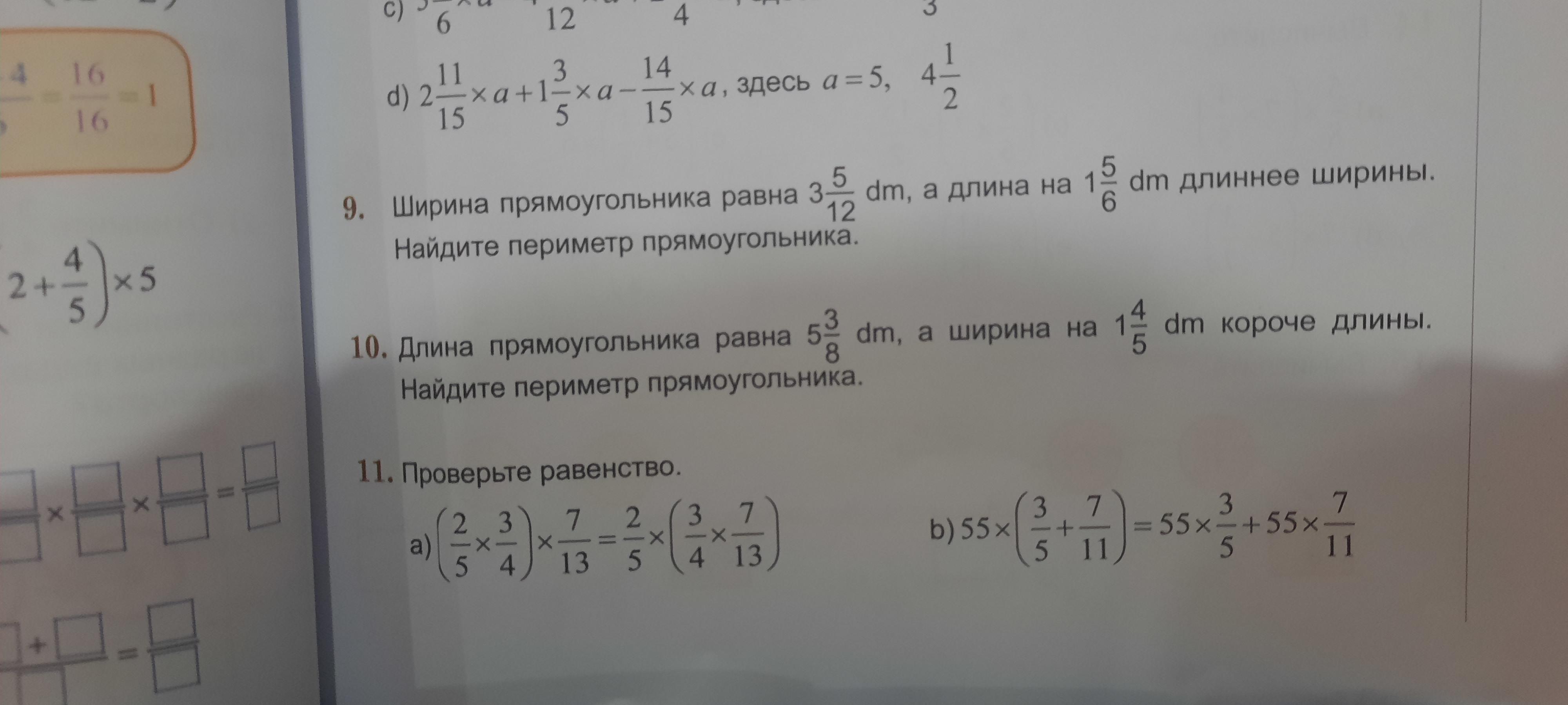 1) 3 5/12 + 1 5/6 = 3 5/12 + 1 10/12 = 4 15/12 = 5 3/12 - (дм) - длина прямоугольника