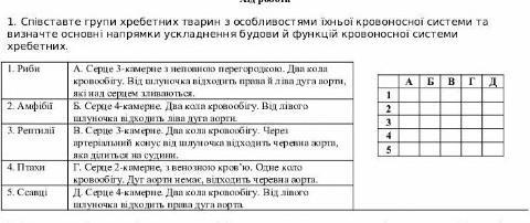1. Співставте групи хребетних тварин з особливостями ïхньої кровоносної системи та визначте основні напрямки ускладнення будови й функцiй кровоносноï системи хребетних