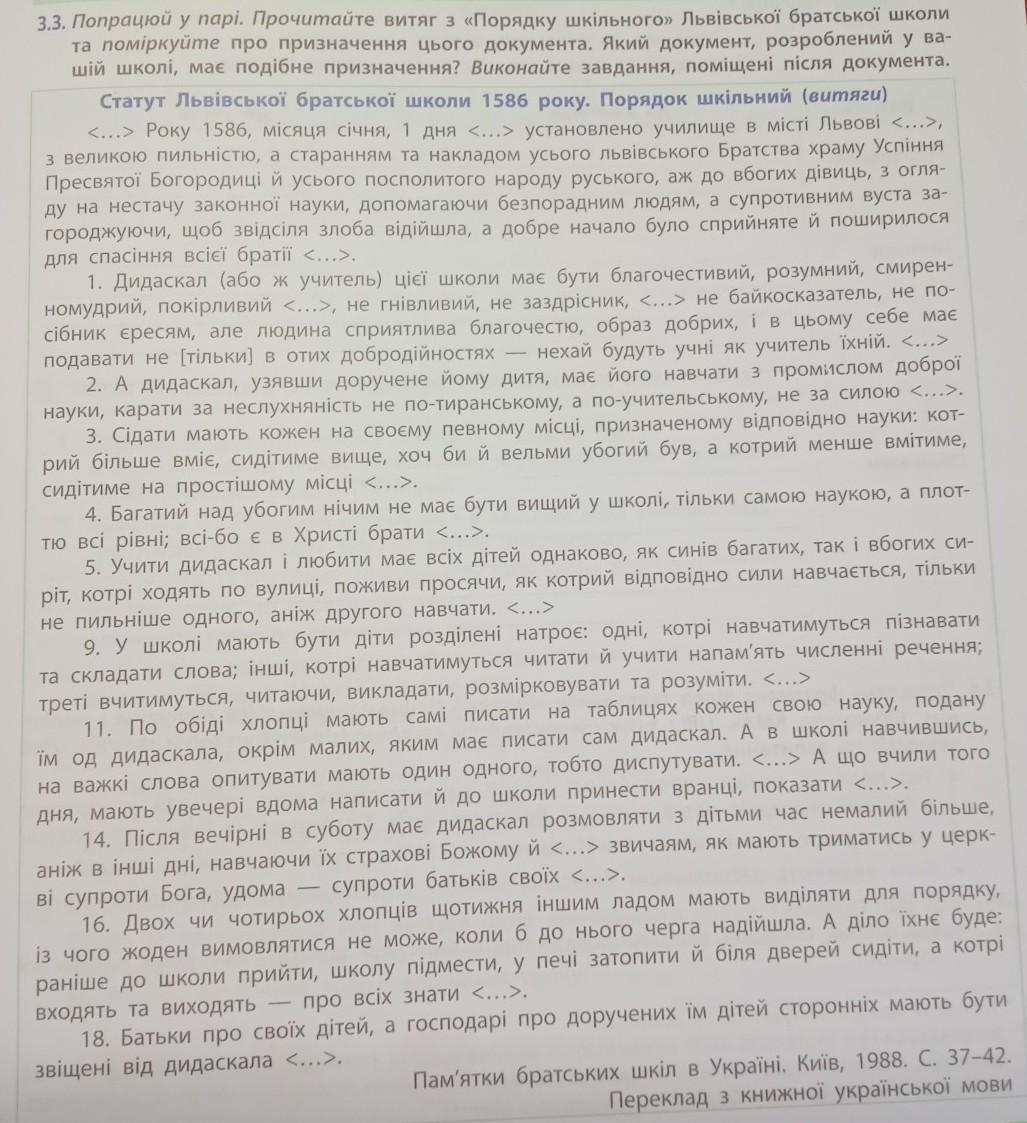 3.3. Попрацю у парі. Прочитайте витяг з «Порядку шкільного» Львівської братської школи та поміркуйте про призначення цього документа. Який документ, розроблений у ва- шій школі, має подібне призначення? Виконайте завдання, поміщені після документа.