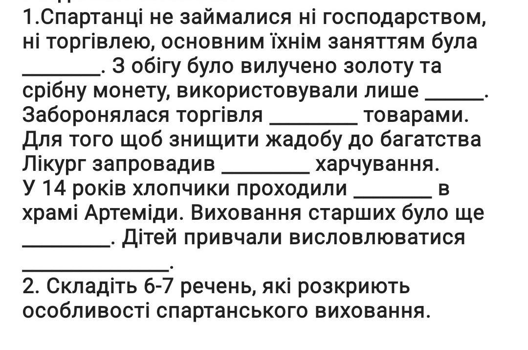 1. Спартанці не займалися ні господарством, ні торгівлею, основним їхнім заняттям була війна. З обігу було вилучено золоту та срібну монету, використовували лише залізні шматки як гроші. Заборонялася торгівля іншими товарами. Для того щоб знищити жадобу до багатства Лікург запровадив спартиатам скромне харчування. У 14 років хлопчики проходили ініціацію в храмі Артеміди. Виховання старших було ще суворішим. Дітей привчали висловлюватися лаконічно й точно.