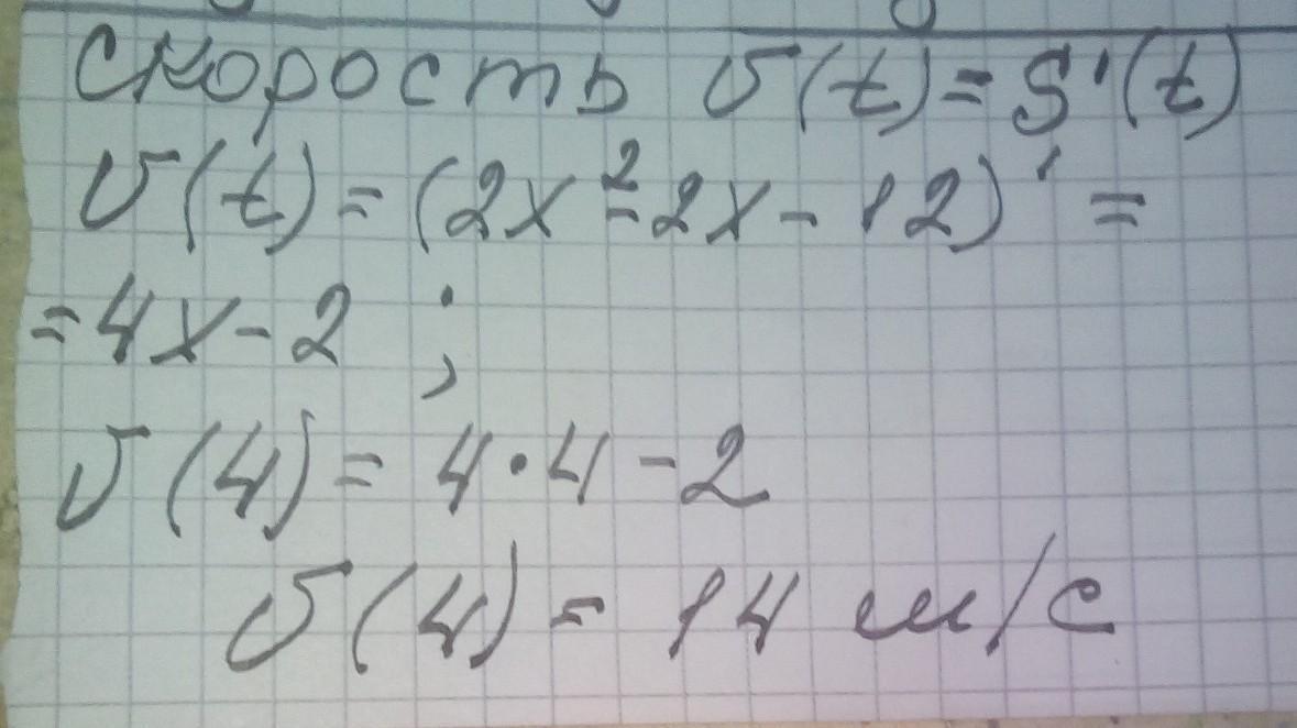 Тело движется по закону s(t) = 2x2 - 2x - 12. Найти скорость движения тела в момент времени t=4