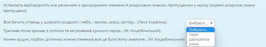 Установіть відповідність між реченням з однорідними членами й розділовим знаком, пропущеним у ньому (окремі розділові знаки пропущено).