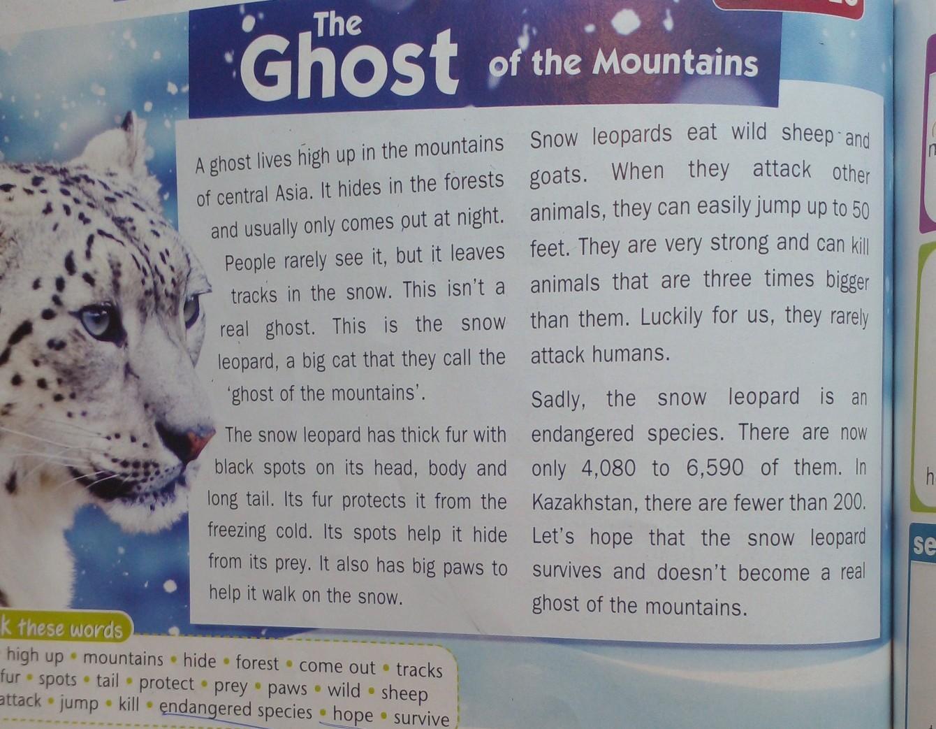 В тексте «The Ghost of the Mountains» розповідається про лінька, яка живе у високогірних регіонах Азії та є дуже рідкісною твариною. Ліньки були відкриті вченими лише у 1970-х роках, і вони до цього часу є дуже малодослідженими. Живуть ліньки у високогірному регіоні зі складним кліматом, де є величезні гірські вершини та багато снігу. Вони вважаються одними з найбільш загрожених видів на землі, оскільки на них полює браконьєрство, зміна клімату та руйнування їх середовища існування. Ліньки називаються «привидами гір», оскільки їх важко помітити в навколишньому середовищі, і їх ще називають «лисицями-кішками», через їх схожість з цими тваринами.