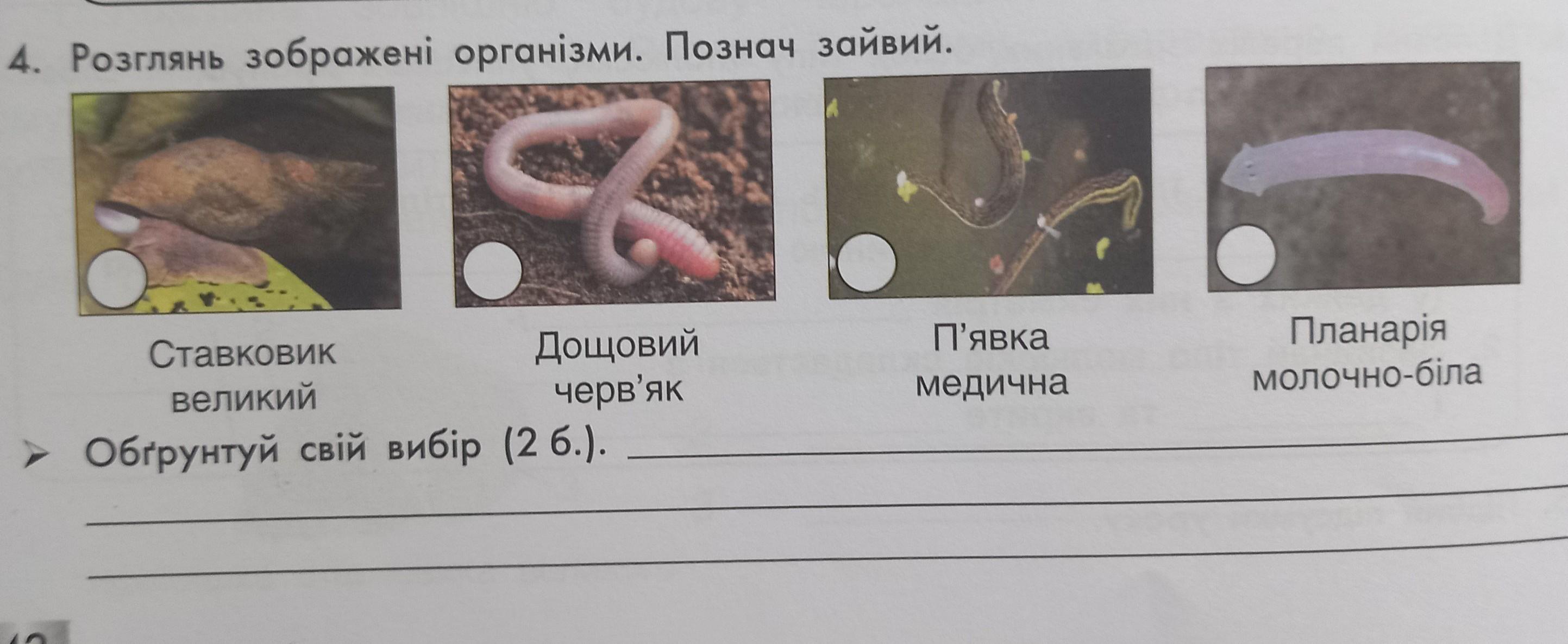 дощовий черв'як, планарія і п'явка відносяться до червів, а ставковик - це молюск (черевоногий)