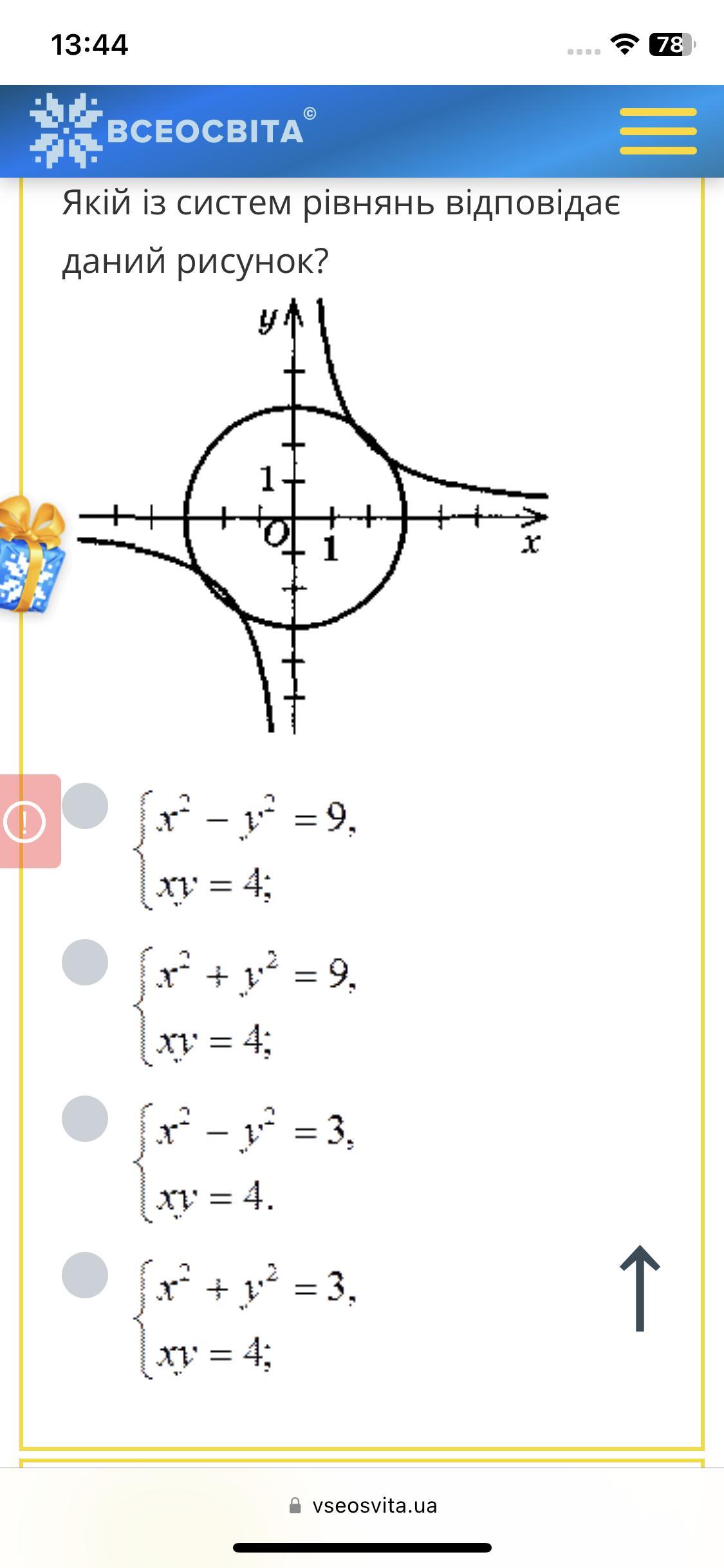 правильна відповідь - друга система: коло з радіусом 3, тобто х^2+у^2=9 і гіпербола ху=4