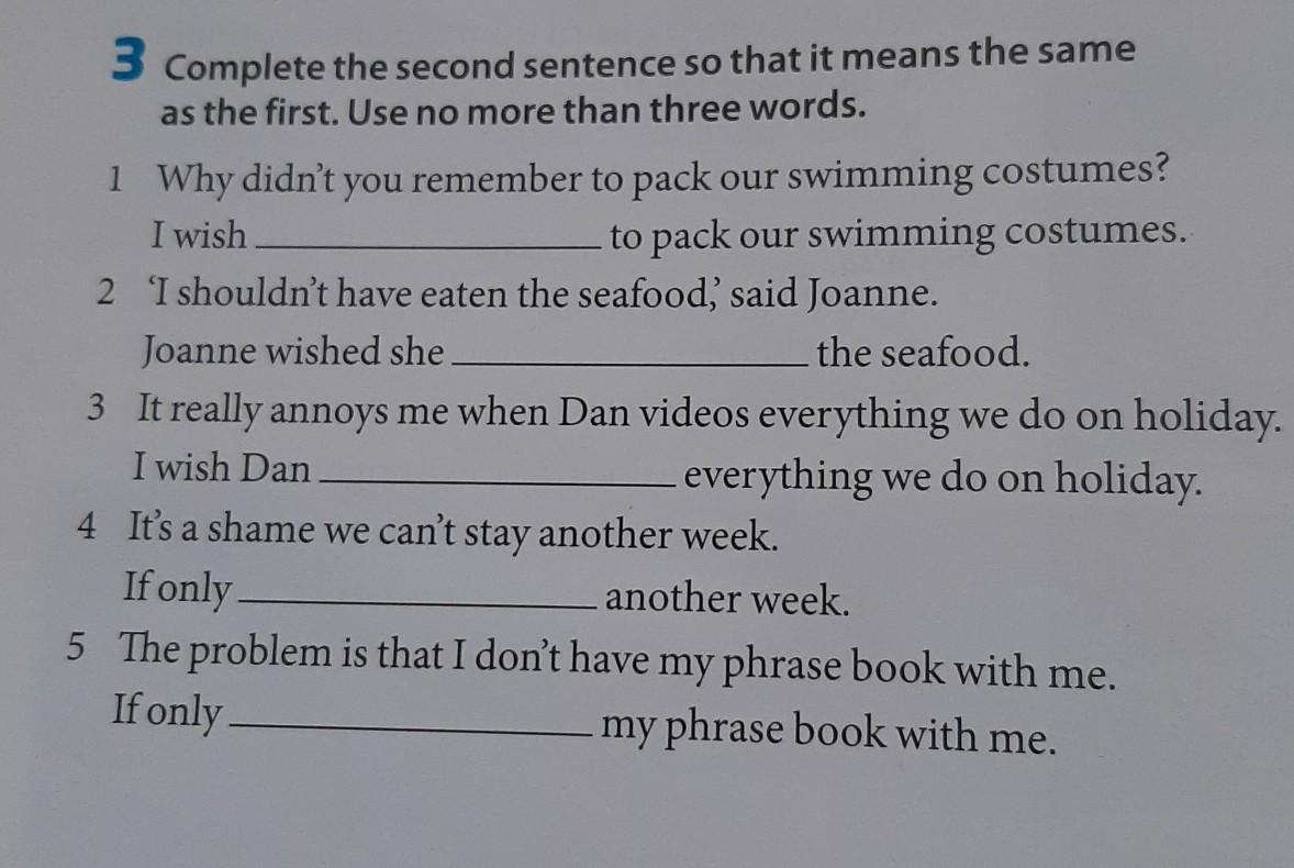 3 Complete the second sentence so that it means the same as the first. Use no more than three words. Why didn't you remember to pack our swimming costumes? to pack our swimming costumes. I wish 2 'I shouldn't have eaten the seafood,' said Joanne. 1 Joanne wished she the seafood. 3 It really annoys me when Dan videos everything we do on holiday. I wish Dan everything we do on holiday. 4 It's a shame we can't stay another week. If only another week. 5 The problem is that I don't have my phrase book with me. If only my phrase book with me.