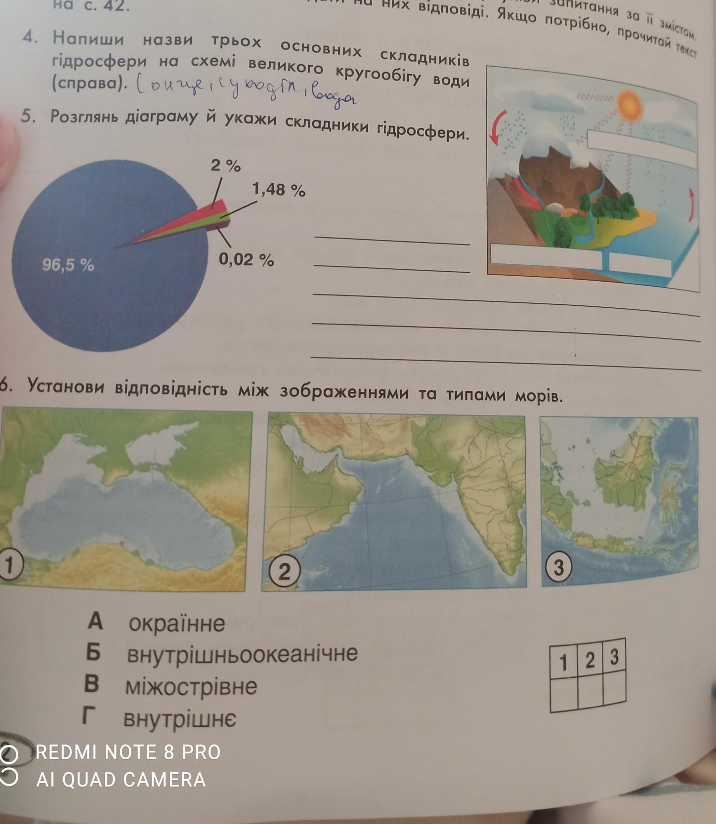 5. Розглянь діаграму й укажи складники гідросфери. 96,5 % 2% 1,48% 0,02 % можна і 6 . ...