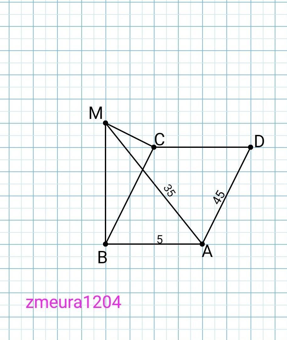 Через вершину в прямокутника ABCD проведено пря МУ ВМ, перпендикулярну до площини прямокутника. Відстань від точки М до прямої AD дорівнює 35 см, AB-5 см, AD=45 см. Знайдіть відстань від точки М до прямой CD.