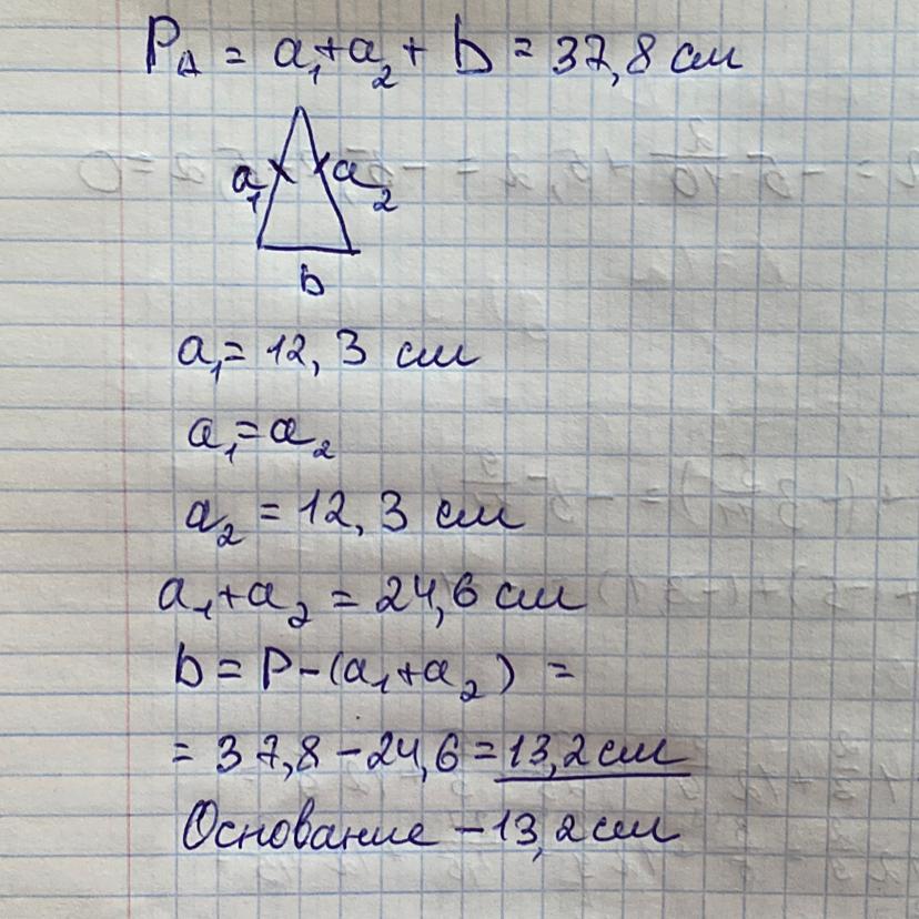 76. Периметр рівнобедреного трикутника дорівнює 37,8 см,а бічна сторона—12,3.Знайди довжину основи