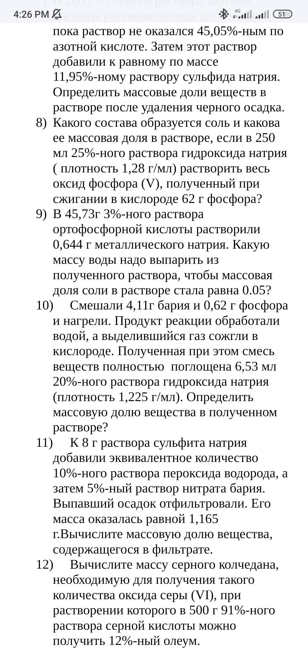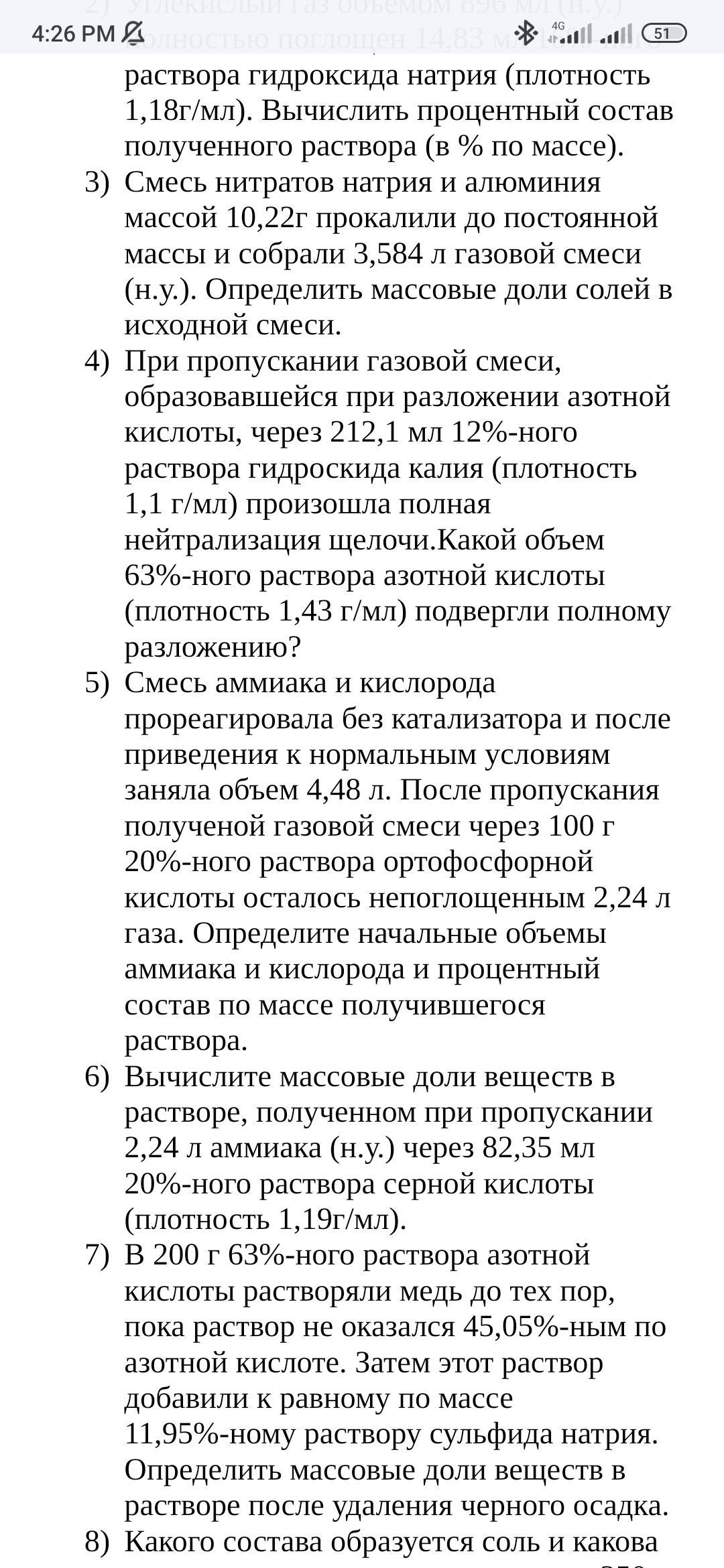 4)При пропускании смеси газов, образовавшихся при разложении азотной кислоты, через 212,1 мл 12%-ного раствора гидроксида калия (плотность 1,1 г/мл) произошла полная нейтрализация щелочи. Определите объем 63%-ного раствора азотной кислоты (плотность 1,43 г/мл), при разложении которой были получены эти газы. Определите массу меди, которая могла бы раствориться в этом объеме раствора азотной кислоты.