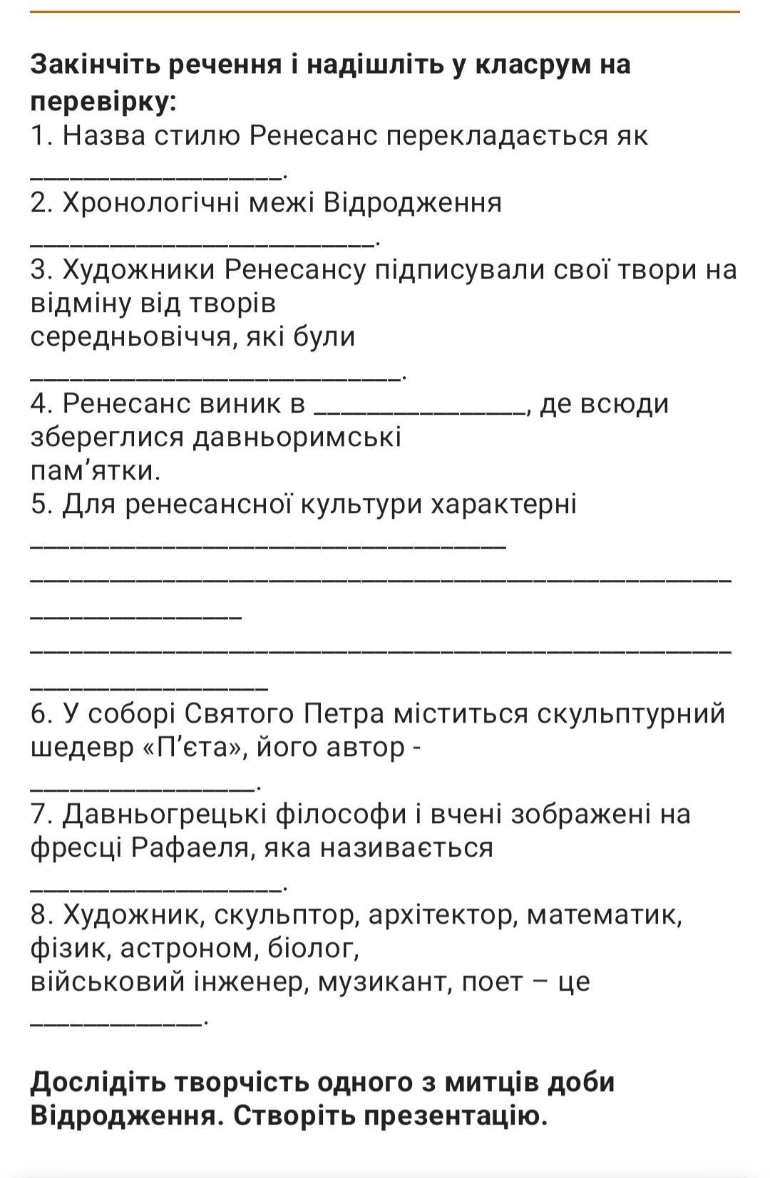 1)"відродження";2)14-16 століття;4)Італія;5) симетрія, рівні пропорції, півколо арки та півсфера купола; ритмічне чергування вікон, колон,пілястр;чіткість і раціональність побудови планів;6) Мікеланджело;7)"Афінська школа";8)Леонардо да Вінчі