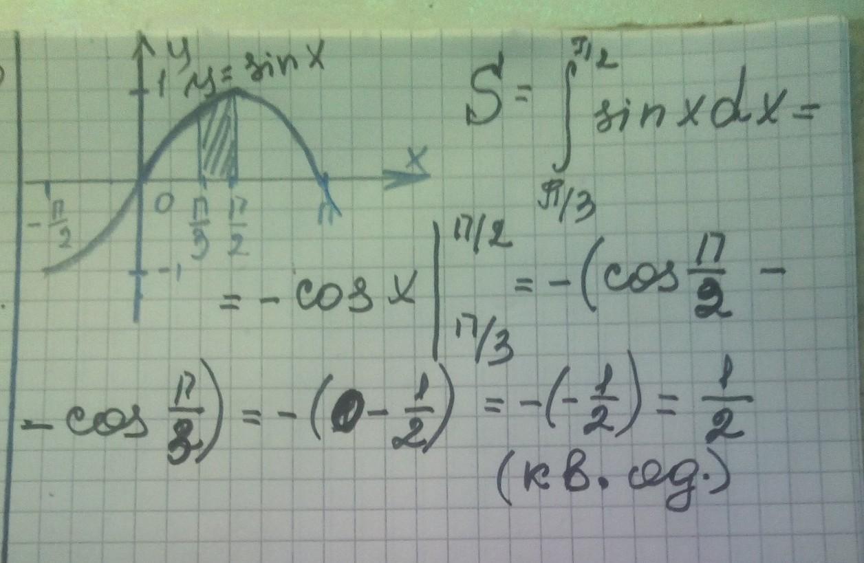 Обчисліть площу криволінійної трапеції, обмеженої графіком функції у = sinx та прямими х=π/3 x=π/2