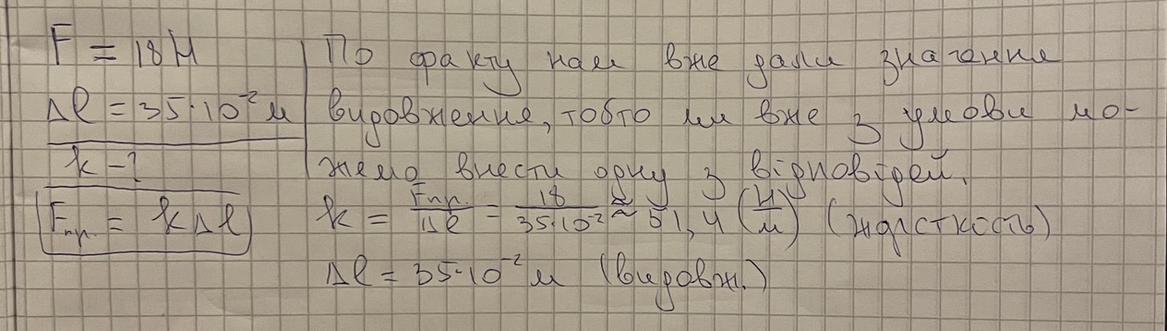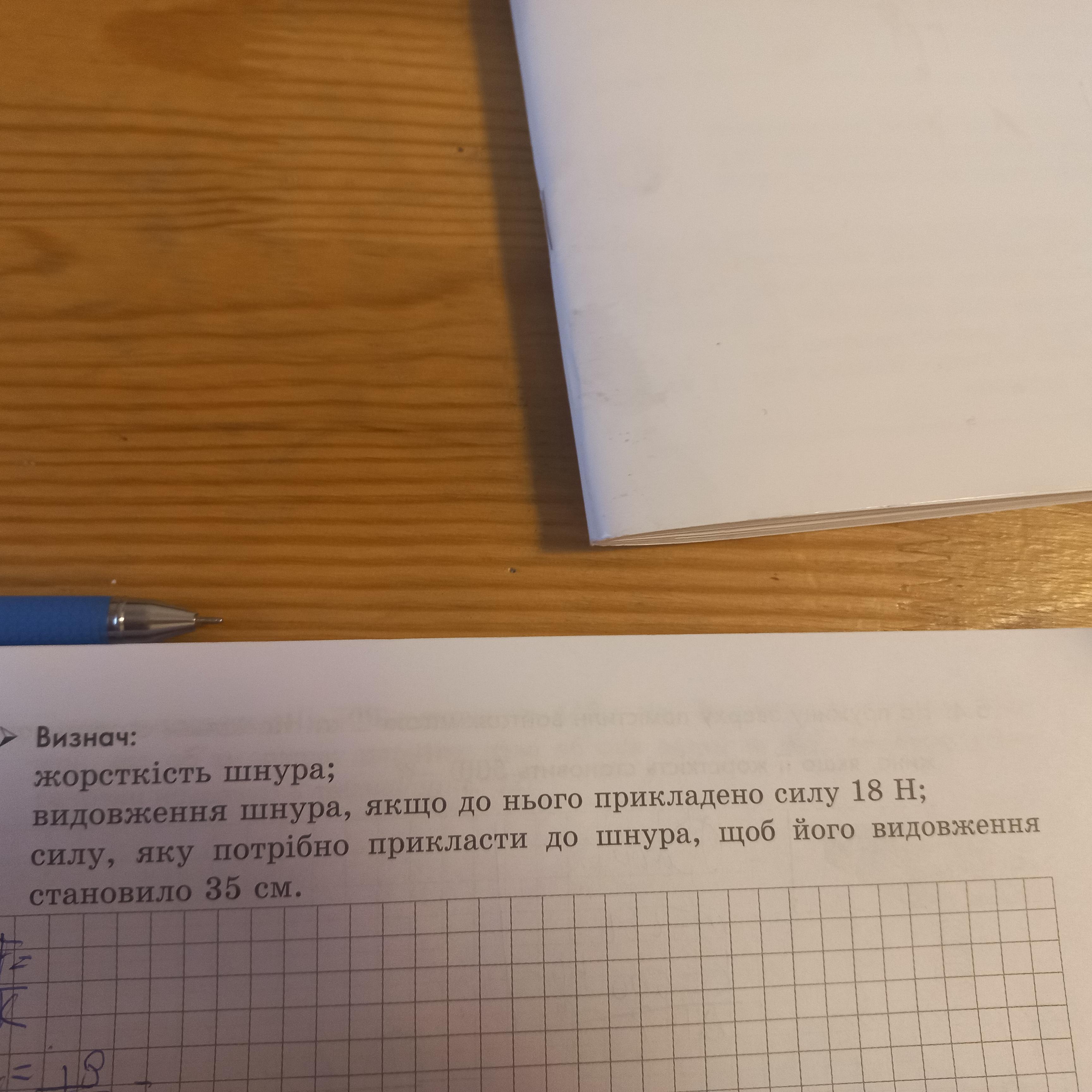 Визнач жорсткість шнура; видовження шнура, якщо до нього прикладено силу 18 H; силу яку потрібно прикласти до шнура щоб його видовження становило 35 см.