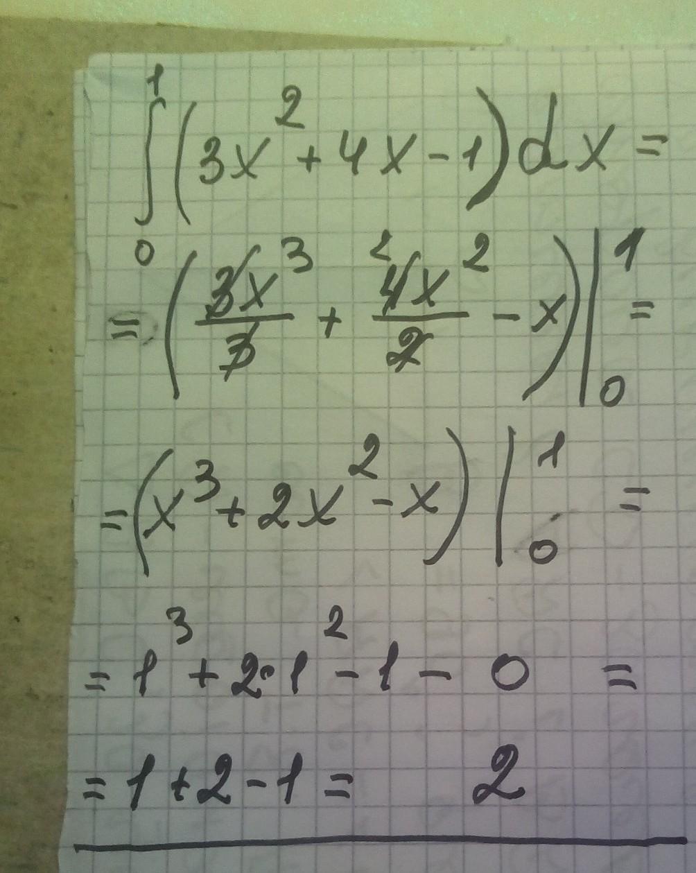 Обчисліть інтеграл\int\limits^1_0 ( 3x^{2} + 4x-1) \, dx