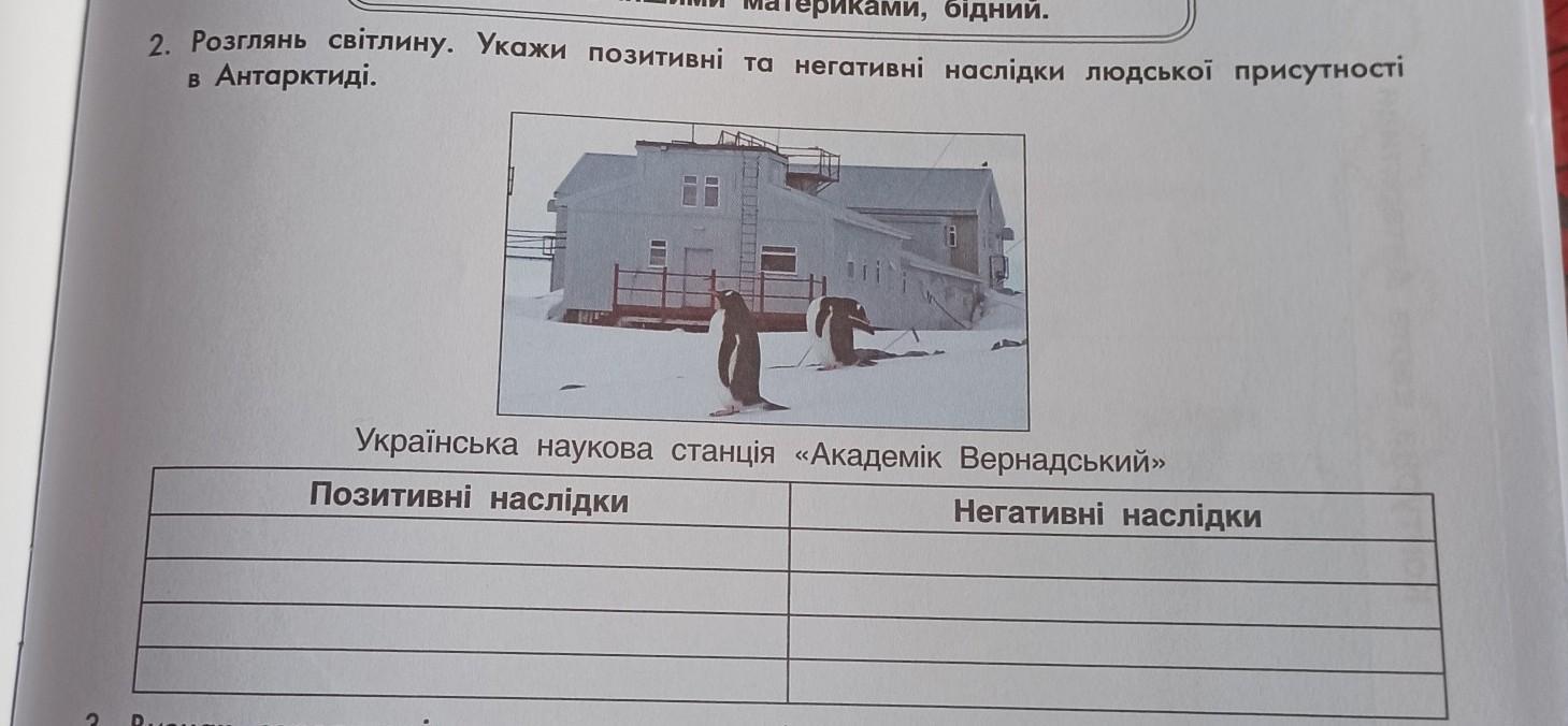 2. Розглянь свiтлину. Укажи позитивні та негативні наслідки людської присутності В Антарктиді. ДАМ 50 БАЛОВ
