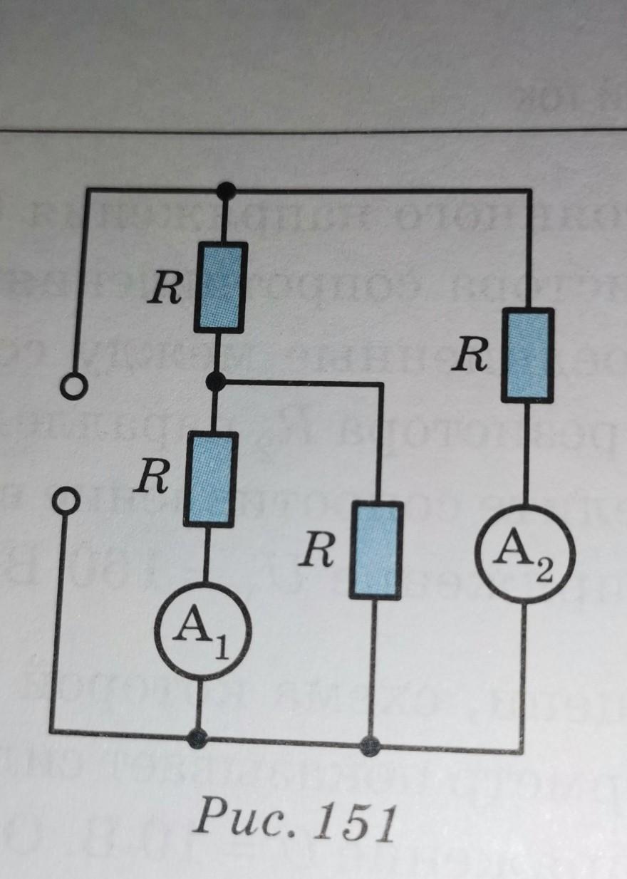 амперметр a1 включённый в электрическую цепь (рис. 151) показывает силу тока I1=1A определите показания амперметра A2, если сопротивлением амперметров пренебречь