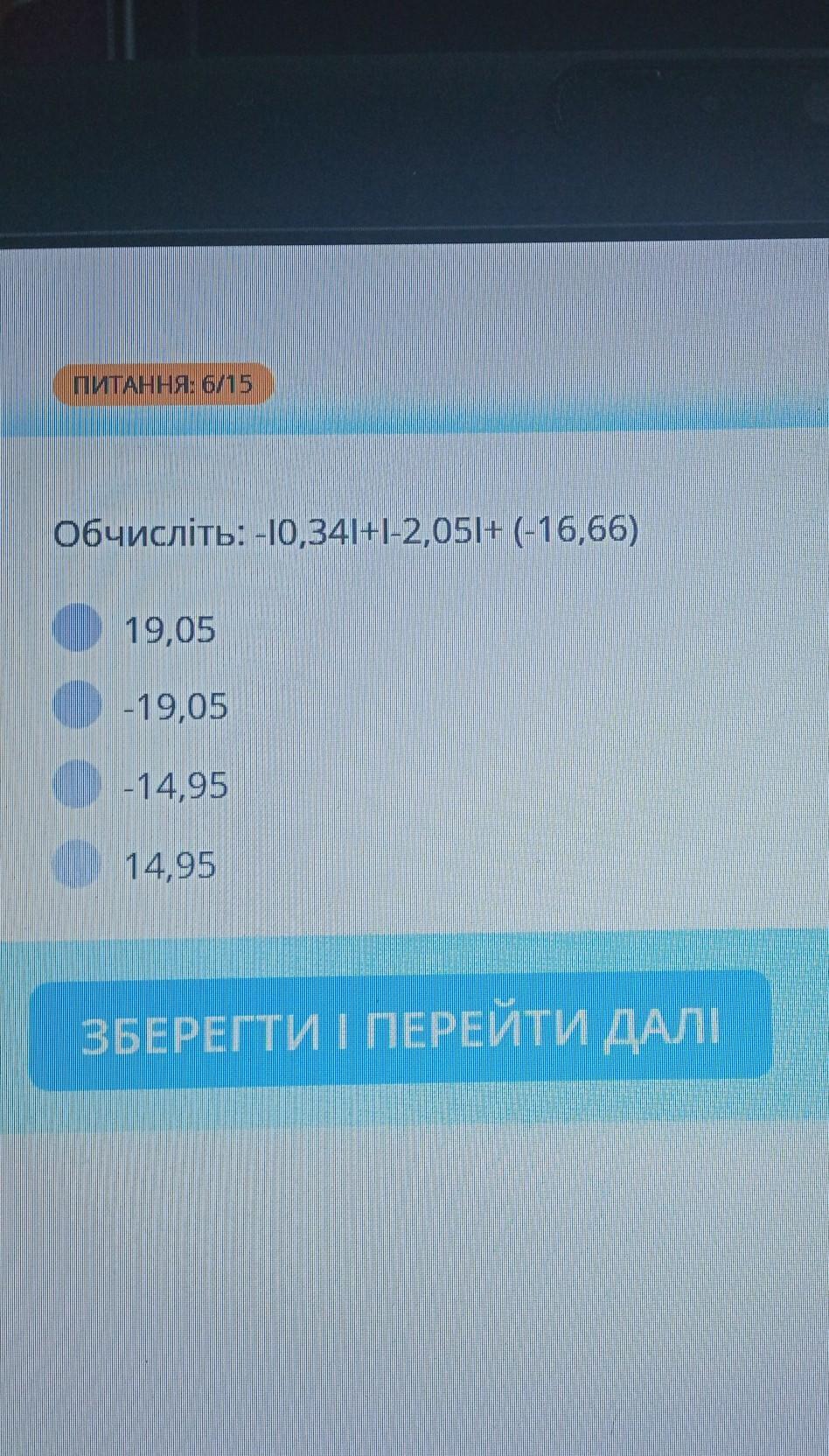 -|0,34|+|-2,05|+(-16,66) = -0,34+2,05-16,66 = -17+2,05 = -14,95.