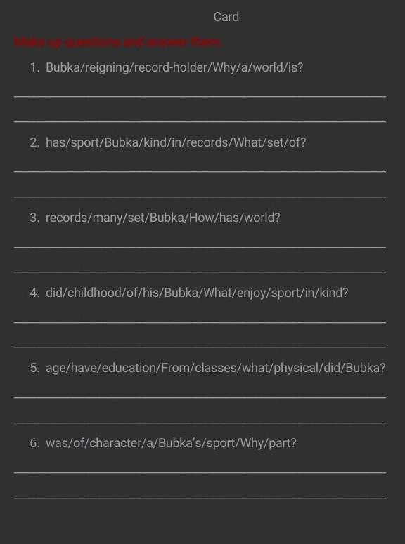 пж срочно дам 50 БАЛОВ!!!!!1. Bubka/reigning/record-holder/Why/a/world/is? 2. has/sport/Bubka/kind/in/records/What/set/of? 3. records/many/set/Bubka/How/has/world? 4. did/childhood/of/his/Bubka/What/enjoy/sport/in/kind? 5. age/have/education/From/classes/what/physical/did/Bubka? 6. was/of/character/a/Bubka's/sport/Why/part?