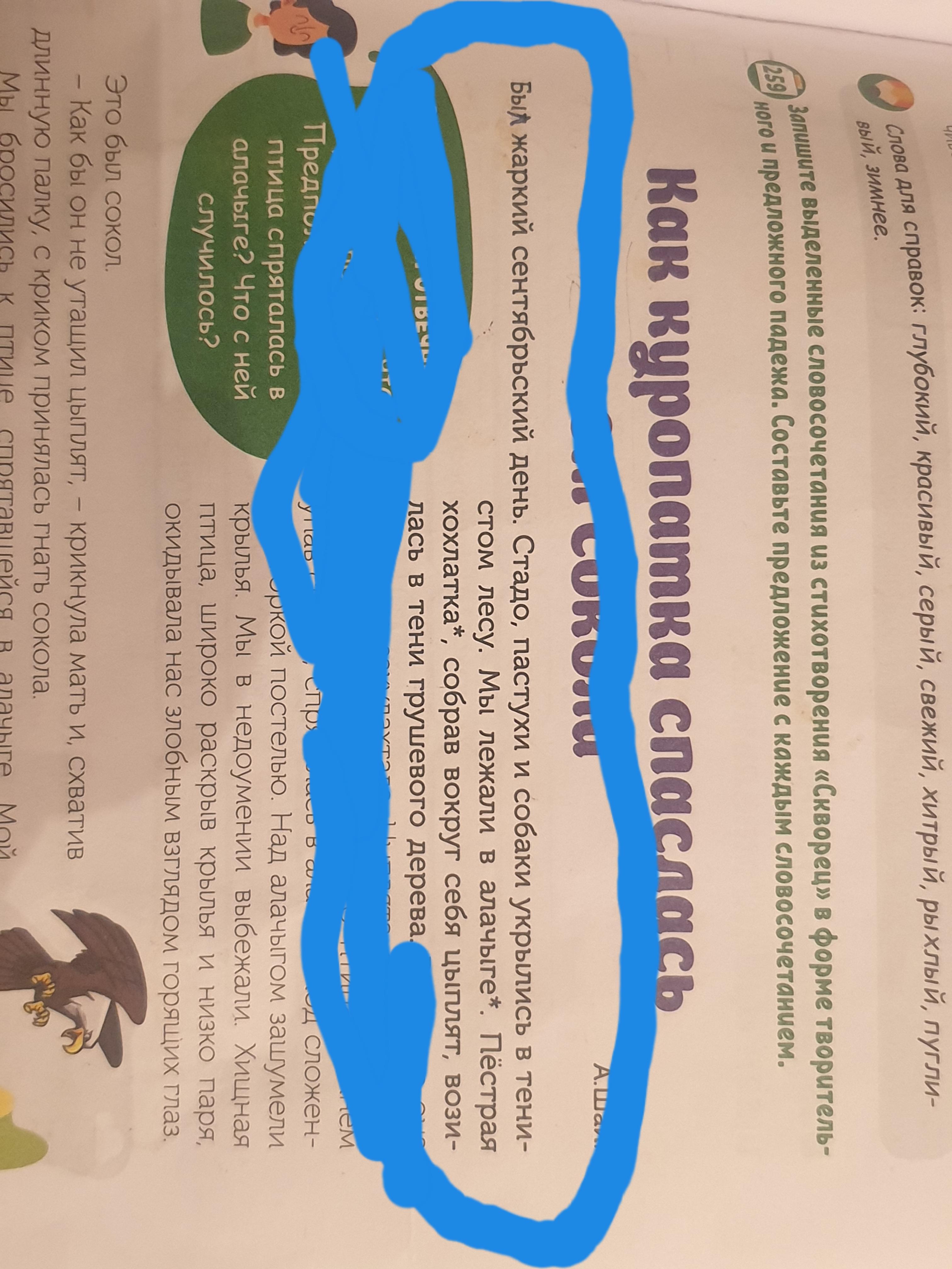 Спишите выделенный фрагмент из текста на стр. 119. Выдилите окончания прилагательных, укажите падеж.