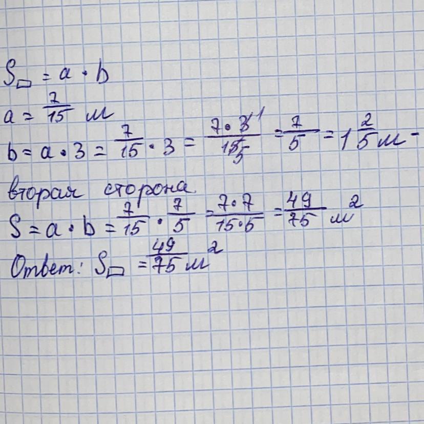 Найди площадь прямоугольника если одна сторона равна 7/15 м,а другая сторона в 3раза больше и решение пожалуйста