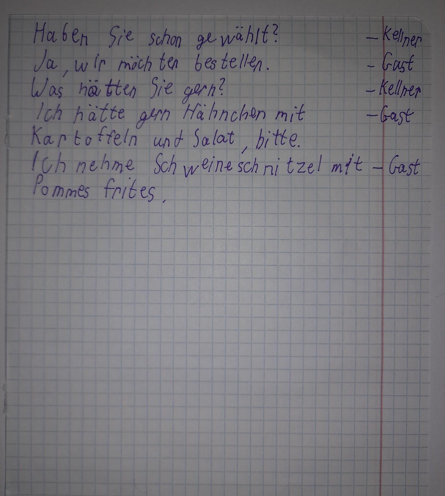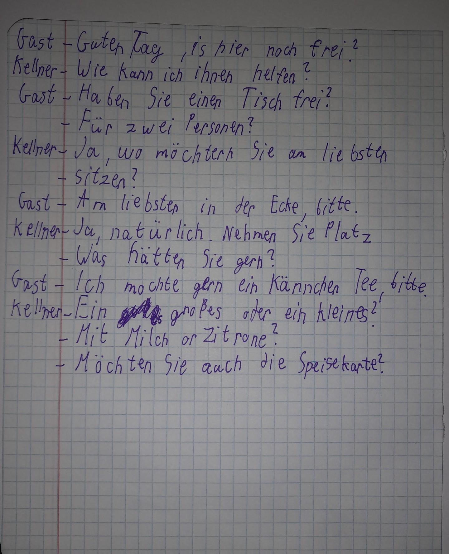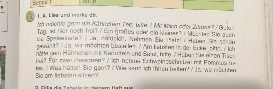 1. A. Lies und merke dir. Ich möchte gern ein Kännchen Tee, bitte. / Mit Milch oder Zitrone? / Guten Tag, ist hier noch frei? / Ein großes oder ein kleines? / Möchten Sie auch die Speisekarte? / Ja, natürlich. Nehmen Sie Platz! / Haben Sie schon gewählt? / Ja, wir möchten bestellen. / Am liebsten in der Ecke, bitte. /Ich hätte gern Hähnchen mit Kartoffeln und Salat, bitte. / Haben Sie einen Tisch frei? Für zwei Personen? / Ich nehme Schweineschnitzel mit Pommes fri- tes. / Was hätten Sie gern? / Wie kann ich Ihnen helfen? / Ja, wo möchten Sie am liebsten sitzen?