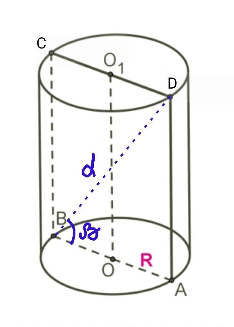 Діагональ осьового перерізу циліндра d i утворює з площиною основи кут ß. Знайти площу основи циліндра.