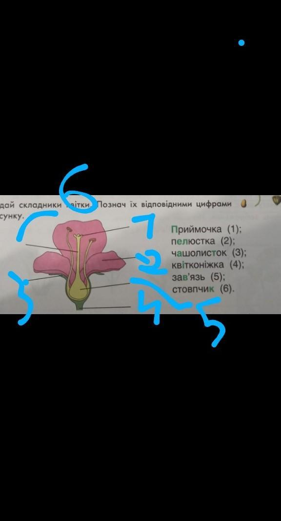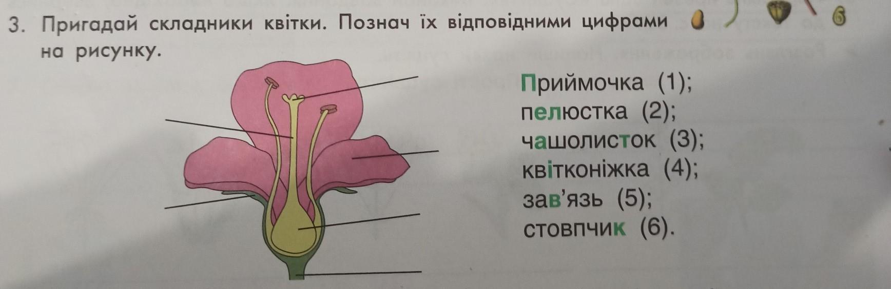 3. Пригадай складники квітки. Познач їх відповідними цифрами на рисунку. Приймочка (1); пелюстка (2); чашолисток (3); квітконіжка (4); зав'язь (5); стовпчик (6).
