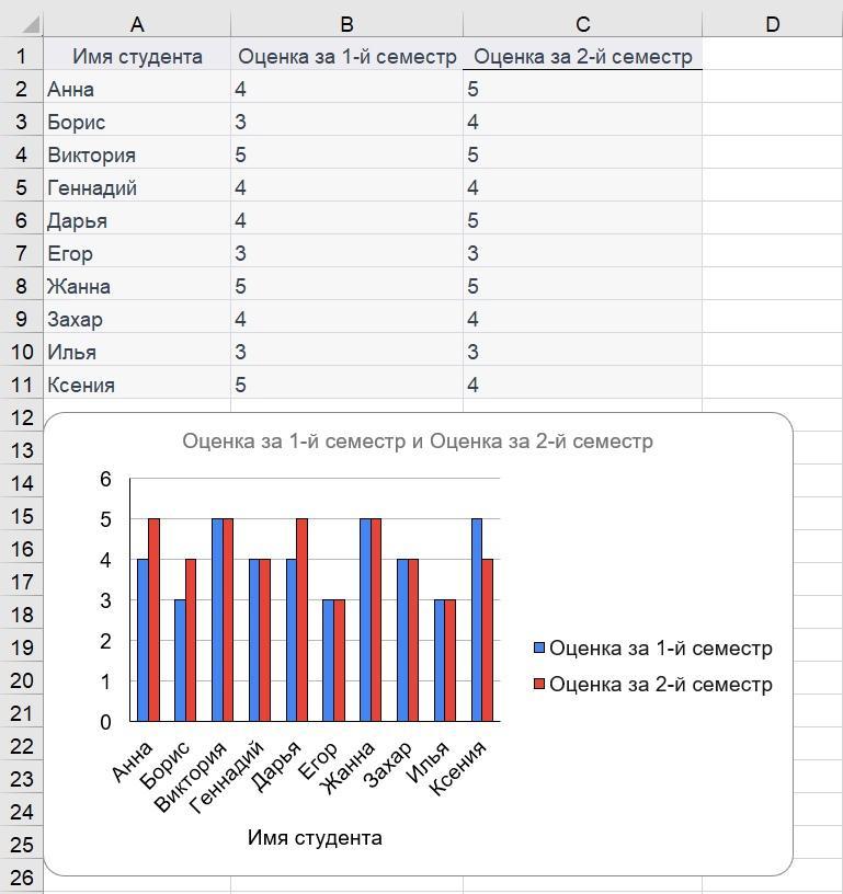 - Настраиваем диаграмму (название: "Оценки студентов", легенда: "1-й семестр", "2-й семестр", цвета и т.д.).