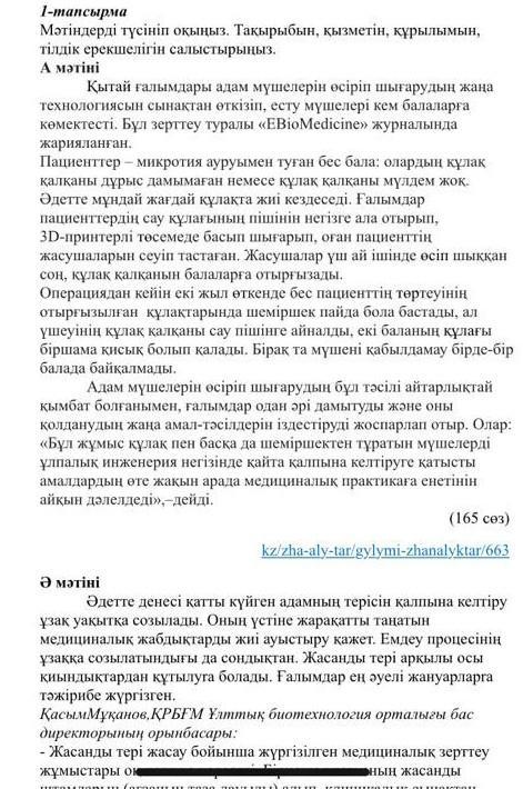 1-тапсырма Мәтiндердi түсiнiп окыныз. Такырыбын, кызметiн, курылымын, тiлдiк ерекшелiгiн салыстырыныз. А мәтіні Қытай галымдары адам мүшелерiн өсiрiп шыгарудын жана технологиясын сынактан өткiзiп, есту мүшелерi кем балаларға көмектесті. Бул зерттеу туралы «EBioMedicine» журналында жарияланган. Пациенттер-микротия ауруымен туган бес бала: олардын кулак калканы дұрыс дамымаған немесе кулак калканы мулдем жок. Әдетте мұндай жағдай кулакта жиi кездеседi. Ғалымдар пациенттердiн сау кулагынын пiшiнiн негізге ала отырып, 3D-принтерлі тесемеде басып шығарып, оған пациенттің жасушаларын сеуіп тастаган. Жасушалар үш ай iшiнде өсіп шыққан сон, кулак калканын балаларга отырғызады. Операциядан кейiн екi жыл өткенде бес пациенттін төртеуiнiн отырғызылган кулактарында шеміршек пайда бола бастады, ал үшеуiнiн кулак калканы сау пiшiнге айналды, екi баланын кулагы бiршама кисык болып калады. Бiрак та мушенi кабылдамау бiрде-бiр балада байкалмады. Адам мүшелерін әсiрiп шығарудын бул тәсiлi айтарлықтай кымбат болганымен, галымдар одан әрi дамытуды және оны колданудын жана амал-тәсiлдерiн iздестiрудi жоспарлап отыр. Олар: