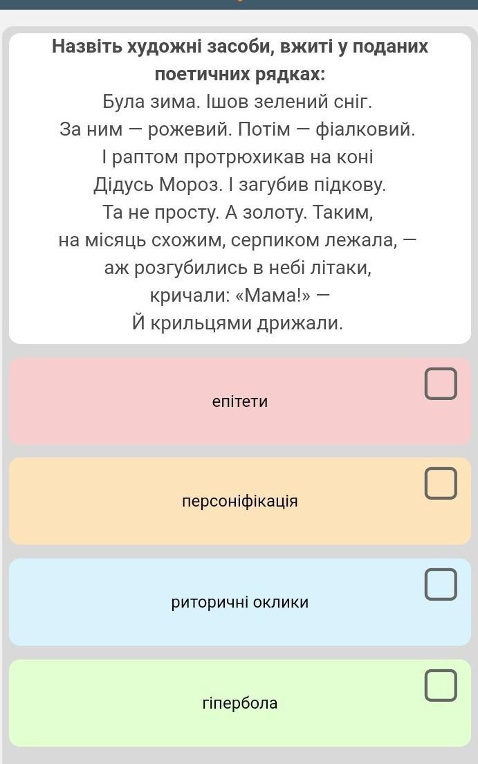 Назвіть художні засоби, вжиті у поданих поетичних рядках: Була зима. Ішов зелений сніг. За ним — рожевий. Потім — фіалковий. Траптом протрюхикав на коні Дідусь Мороз. І загубив підкову. Та не просту. А золоту. Таким, на місяць схожим, серпиком лежала, аж розгубились в небі літаки, кричали: «Мама!» Й крильцями дрижали. -
