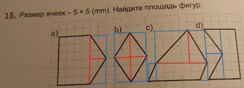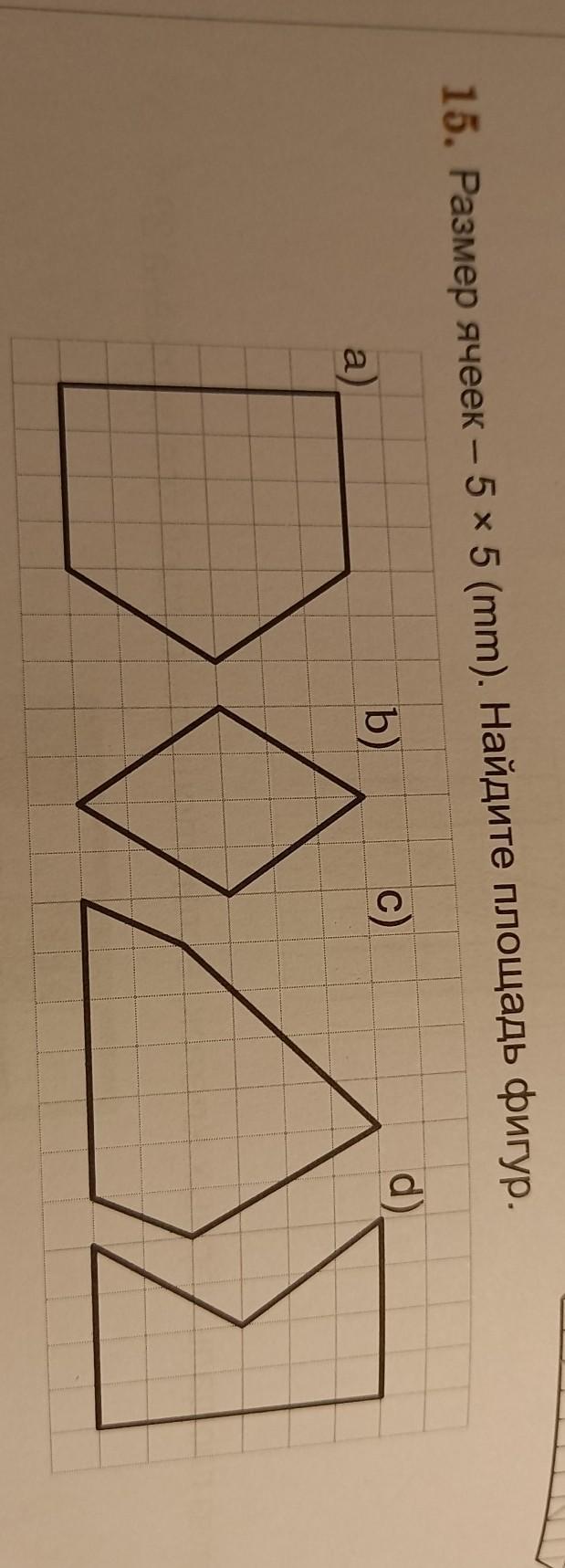 15. Размер ячеек - 5 × 5 (mm). Найдите площадь фигур.