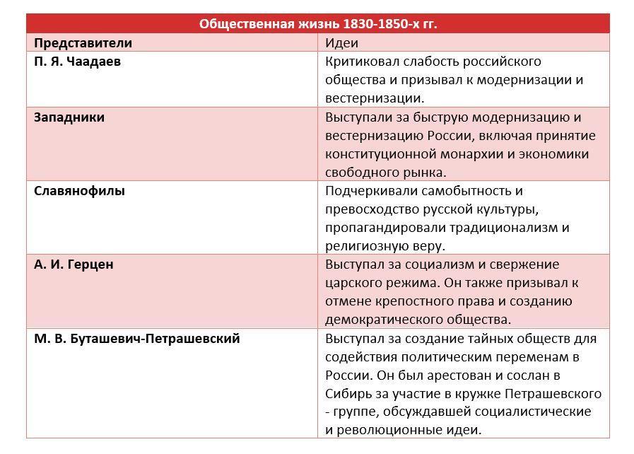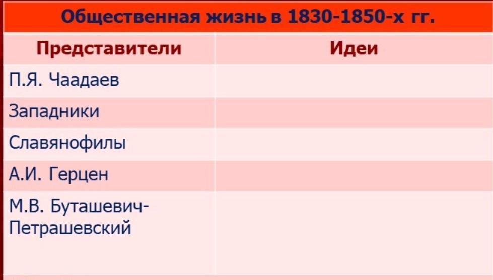 Таблица по теме "Общественная и духовная жизнь 1830-1850-х гг.":