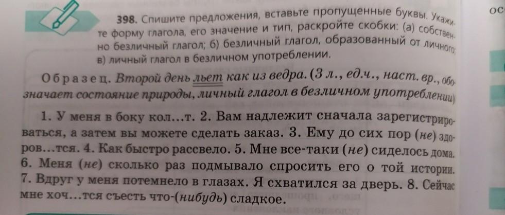 398. Спишите предложения, вставьте пропущенные буквы. Укаж Те форму глагола, его значение и тип, раскройте скобки: (а) собстве но безличный глагол, 6) безличный глагол, образованный от в) личный глагол в безличном употреблении Образец. Второй день льет как из ведра. (3 л., ед.ч., наст. вр., бе значает состояние природы, личный глагол в безличном употреблени 1. У меня в боку кол...т. 2. Вам надлежит сначала зарегистрир ваться, а затем вы можете сделать заказ. 3. Ему до сих пор (не) ров...тся. 4. Как быстро рассвело. 5. Мне все-таки (не) сиделось дома, 6. Меня (не) сколько раз подмывало спросить его о той истории 7. Вдруг у меня потемнело в глазах. Я схватился за дверь. 8. Сейчас мне хоч...тся съесть что-нибудь) сладкое.