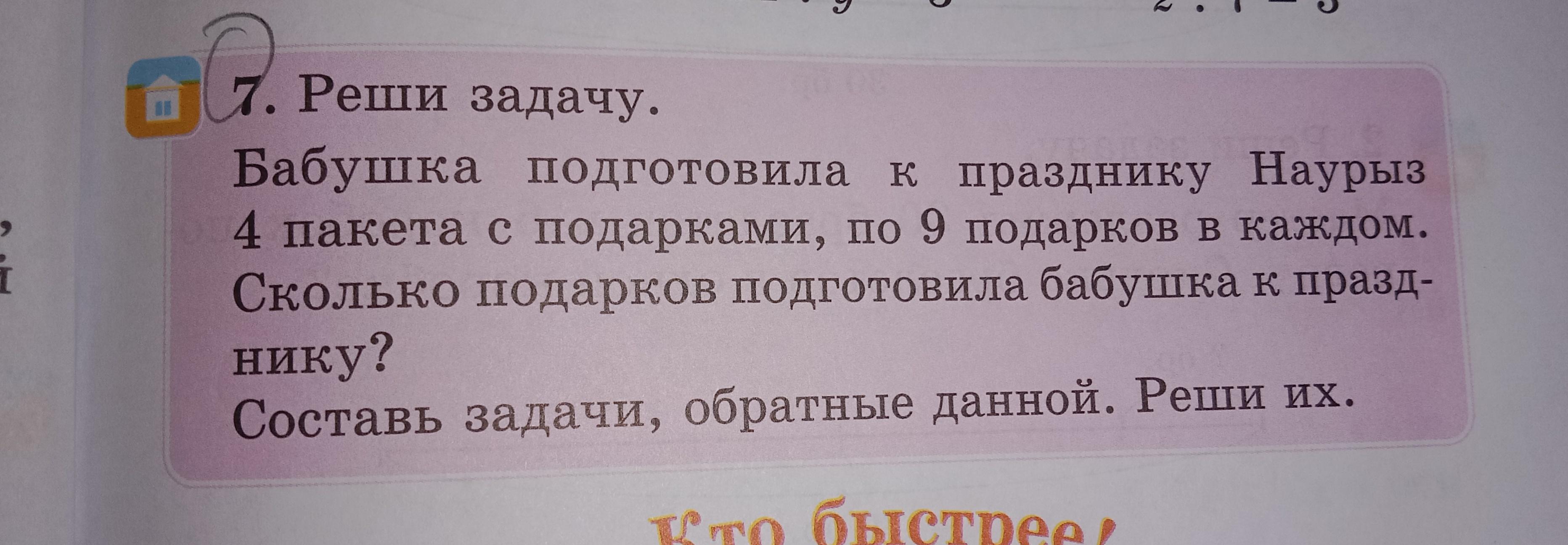 Бабушка подготовила к празднику Наурыз 36 подарков. Подарки она поместила в пакеты. Сколько пакетов потребовалось бабушке, если 1 пакет вмещает 9 подарков?