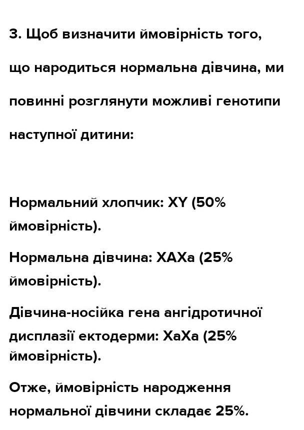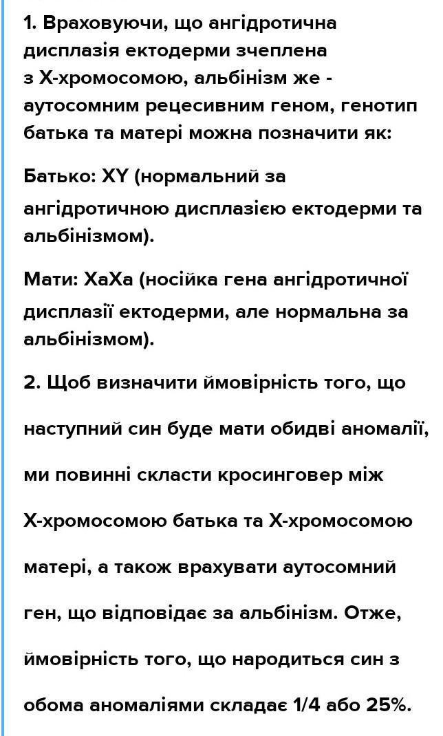 2. Щоб визначити ймовірність того, що наступний син буде мати обидві аномалії, ми повинні скласти кросинговер між X-хромосомою батька та X-хромосомою матері, а також врахувати аутосомний ген, що відповідає за альбінізм. Отже, ймовірність того, що народиться син з обома аномаліями складає 1/4 або 25%.